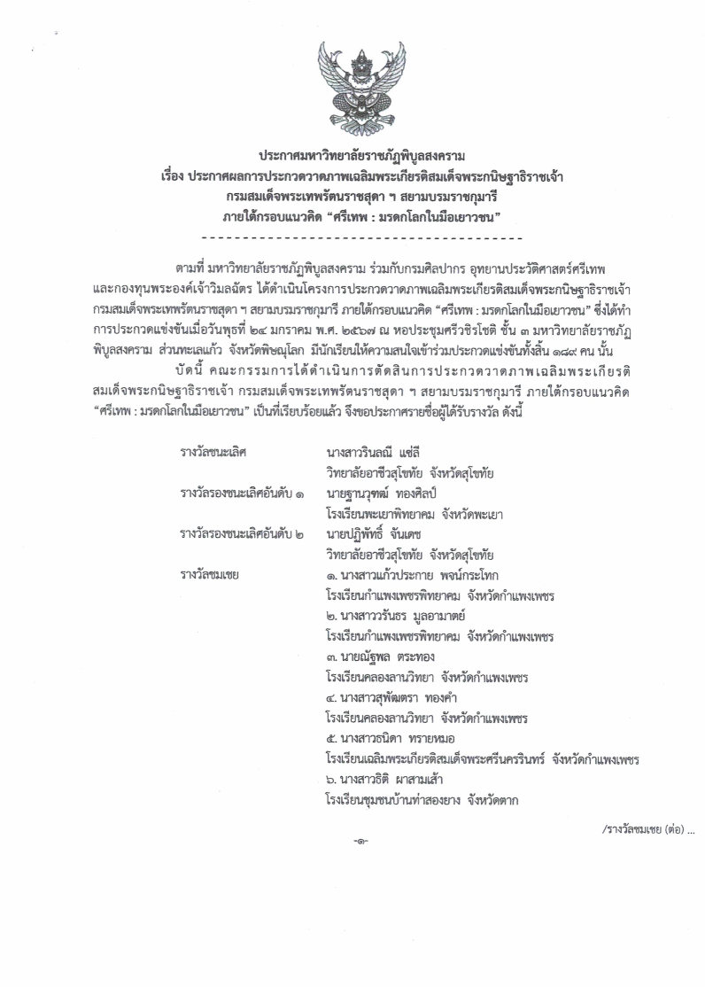 #ประกาศผลการประกวดวาดภาพเฉลิมพระเกียรติ สมเด็จพระกนิษฐาธิาชเจ้า กรมสมเด็จพระเทพรัตนราชสุดา สยามบรมราชกุมารี ภายใต้กรอบแนวคิด “ศรีเทพ : มรดกโลกในมือเยาวชน” แช่งขันเมื่อวันพุธที่ 24 มกราคม พ.ศ. 2567 ณ หอประชุมศรีวชิรโชติ มหาวิทยาลัยราชภัฏพิบูลสงคราม (ส่วนทะเลแก้ว) จ.พิษณุโลก