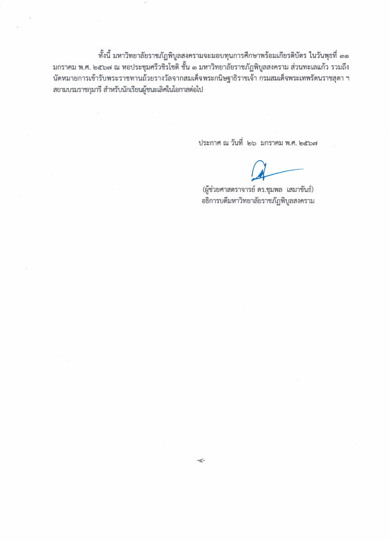 #สำหรับนักเรียนผู้มีรายชื่อรับทุนการศึกษา พร้อมเกียรติบัตร ให้มาในวันพุธที่ 31 มกราคม พ.ศ.2567 โดยให้มารายงานตัวที่จุดลงทะเบียน เวลา 8.00 น. ณ หอประชุมศรีวชิรโชติ มหาวิทยาลัยราชภัฏพิบูลสงคราม ส่วนทะเลแก้ว จ.พิษณุโลก