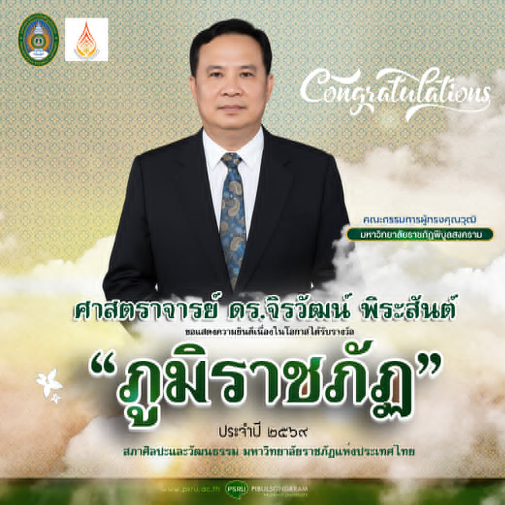 ศาสตราจารย์ ดร.จิรวัฒน์ พิระสันต์ คณะกรรมการผู้ทรงคุณวุฒิ สภามหาวิทยาลัยราชภัฏพิบูลสงคราม ในโอกาสได้รับรางวัล “ภูมิราชภัฏ” ประจำปี 2569 โดย สภาศิลปะและวัฒนธรรม มหาวิทยาลัยราชภัฏแห่งประเทศไทย มีการมอบรางวัล “ภูมิราชภัฏ” สำหรับผู้มีความรู้และความเชี่ยวชาญ สืบสาน สร้างหรือรังสรรค์องค์ความรู้ ขอบข่ายภูมิปัญญาไทยด้านใดด้านหนึ่ง