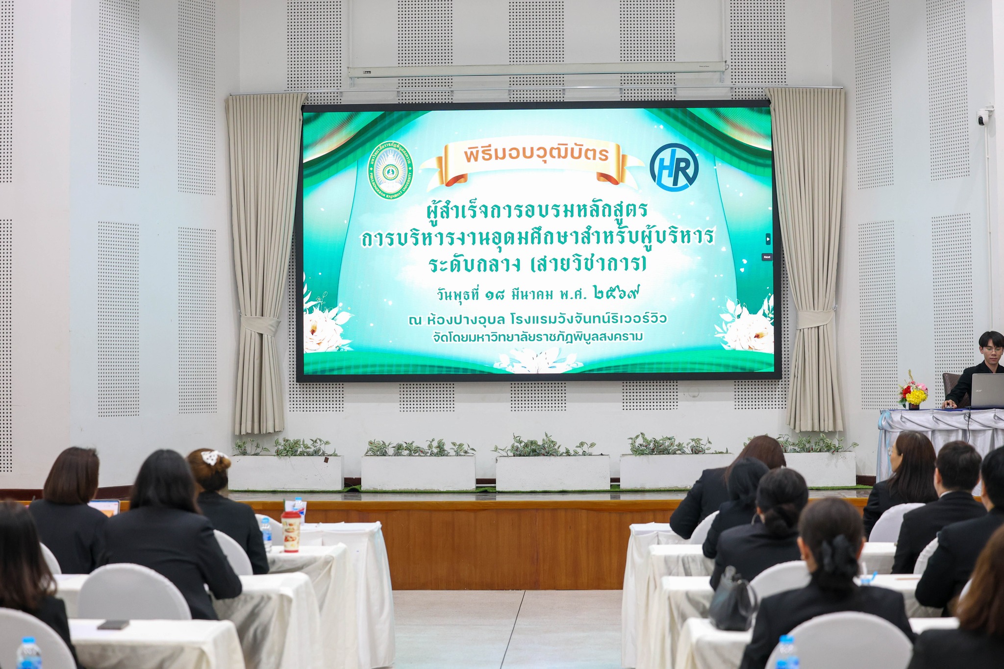 วันที่ 18 มีนาคม 2569 กองบริหารงานบุคคล มหาวิทยาลัยราชภัฏพิบูลสงคราม จัดพิธีปิด นำเสนอสรุปผลการอบรม พร้อมมอบวุฒิบัตรและประดับเข็มรุ่น ให้แก่ผู้ผ่านการอบรมหลักสูตรการบริหารงานอุดมศึกษาสำหรับผู้บริหารระดับกลาง (สายวิชาการ) จำนวน 45 ท่าน โดยได้รับเกียรติจาก ผู้ช่วยศาสตราจารย์ ดร.ชุมพล เสมาขันธ์ อธิการบดีมหาวิทยาลัยราชภัฏพิบูลสงคราม เป็นประธานกล่าวให้โอวาทและแสดงความยินดีแก่ผู้ผ่านการอบรม